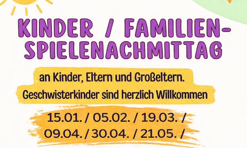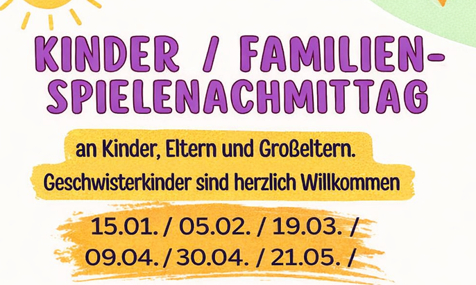 Herzliche Einladung an Kinder, Eltern und Großeltern zu einem fröhlichen Spielenachmittag. Freuen Sie sich auf gemeinsame Zeit, viele Spielmöglichkeiten und eine entspannte Atmosphäre. Für das leibliche Wohl ist bestens gesorgt. Geschwisterkinder sind herzlich willkommen!