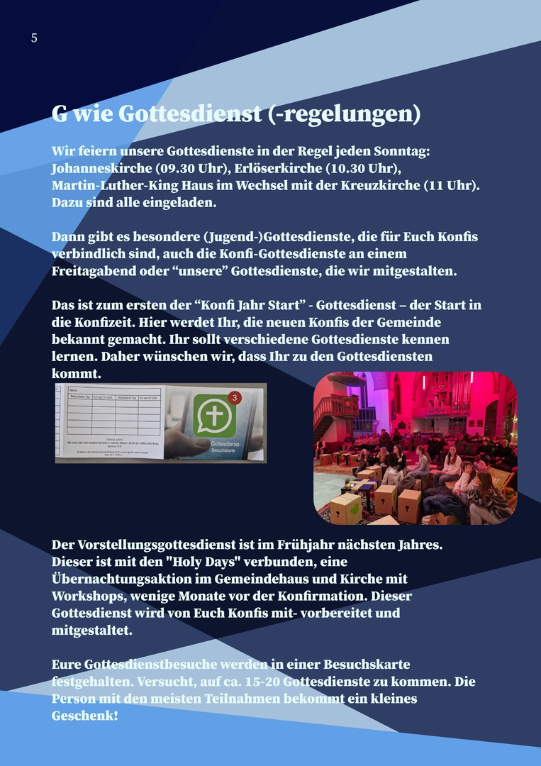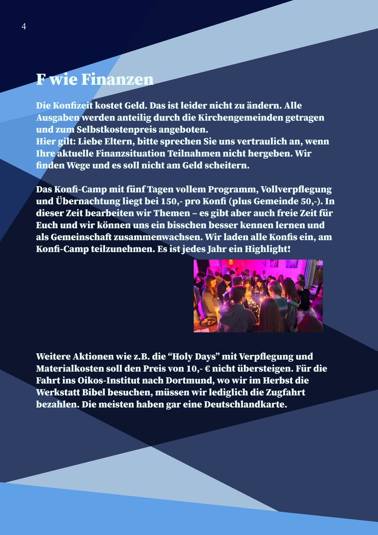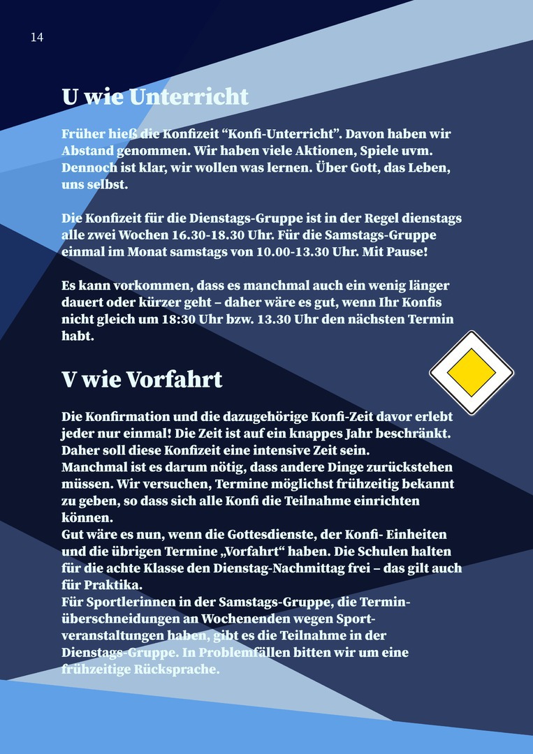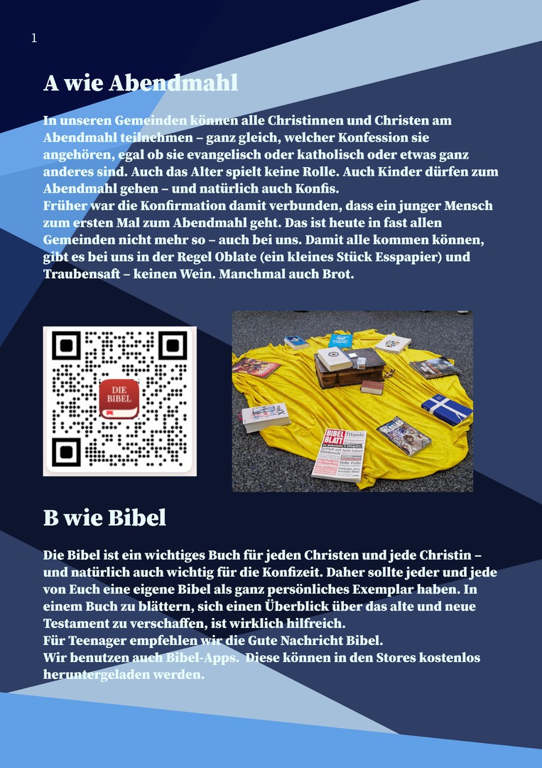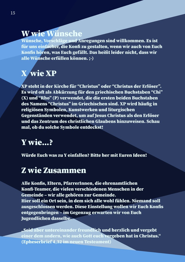 Im Konfi-ABC lernen die Jugendlichen Schritt für Schritt die Grundlagen des christlichen Glaubens kennen – von A wie Abendmahl bis Z wie Zusammen. Denn im Mittelpunkt steht das gemeinsame Erleben: zusammen glauben, zusammen feiern, zusammen unterwegs sein.