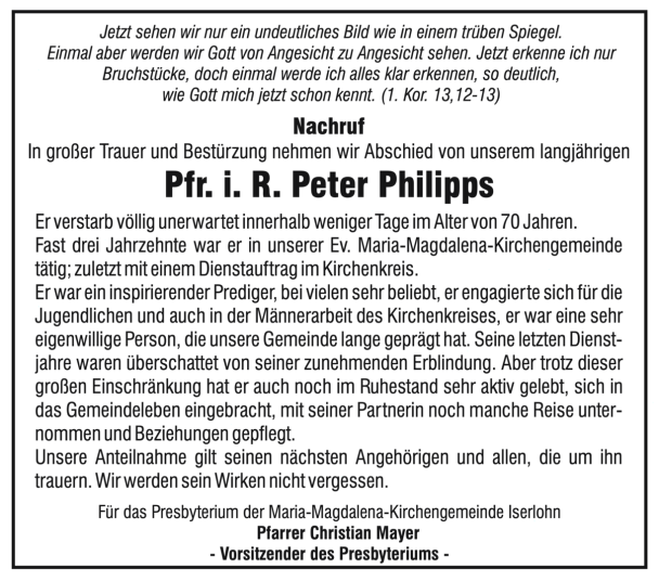 Verstorben ist Pfarrer i. R. Peter Philipps.